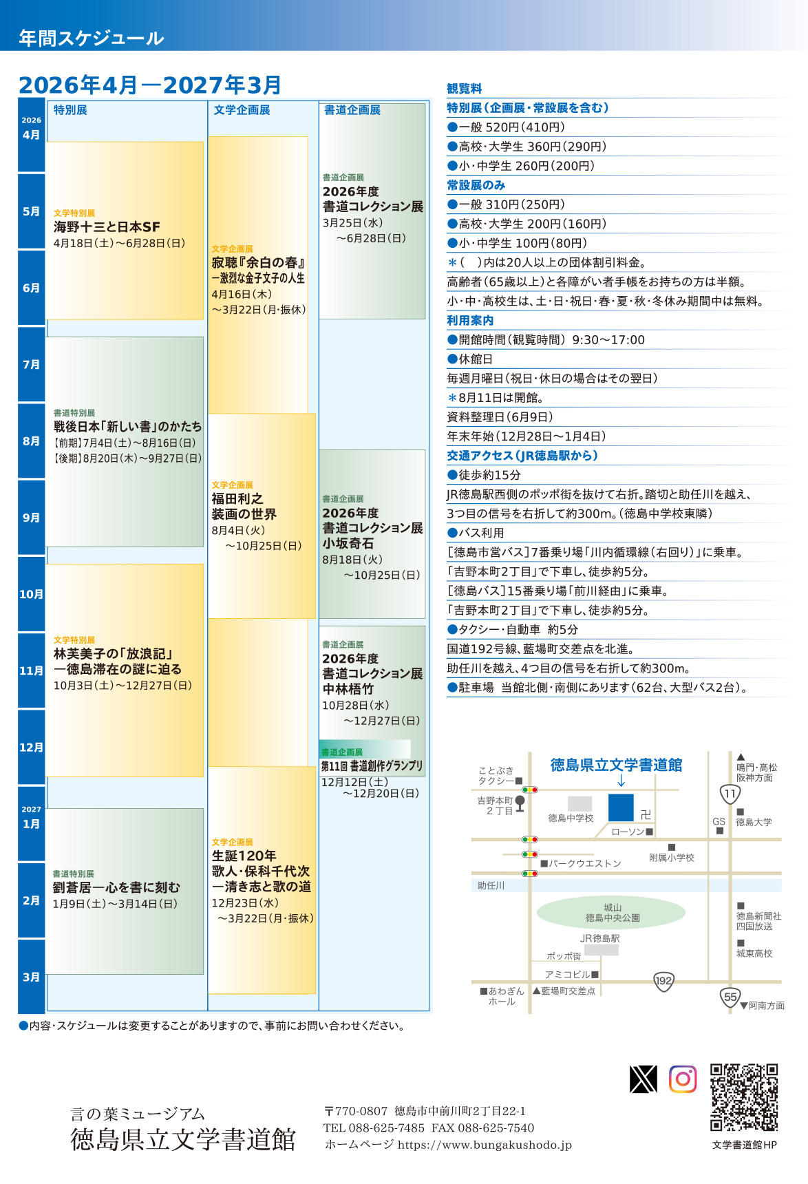 徳島県立文学書道館は、文学館と書道美術館が複合された施設です。文学・書道に関する作品や資料の収集・保存や調査研究、展示紹介の他、講座や実習の開催などを通して文化活動の場を提供します。